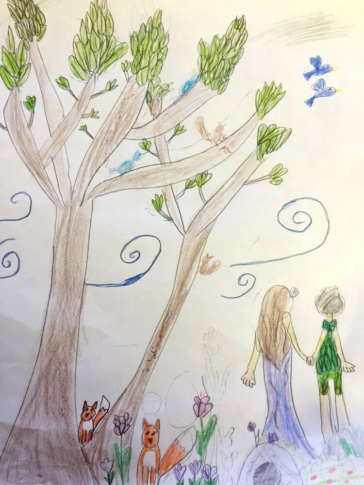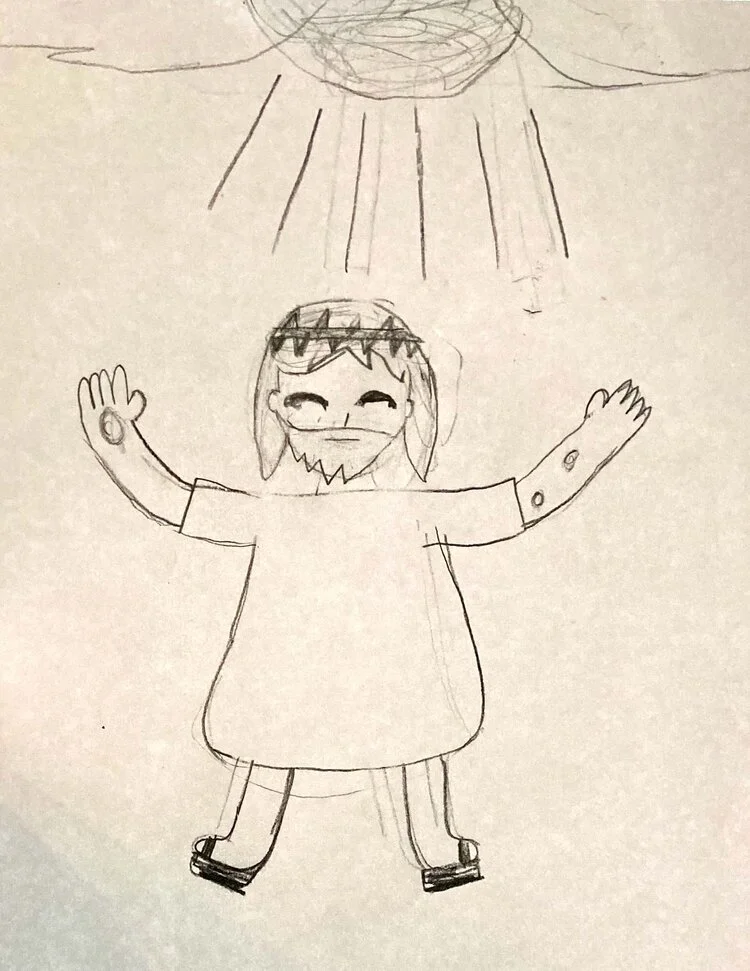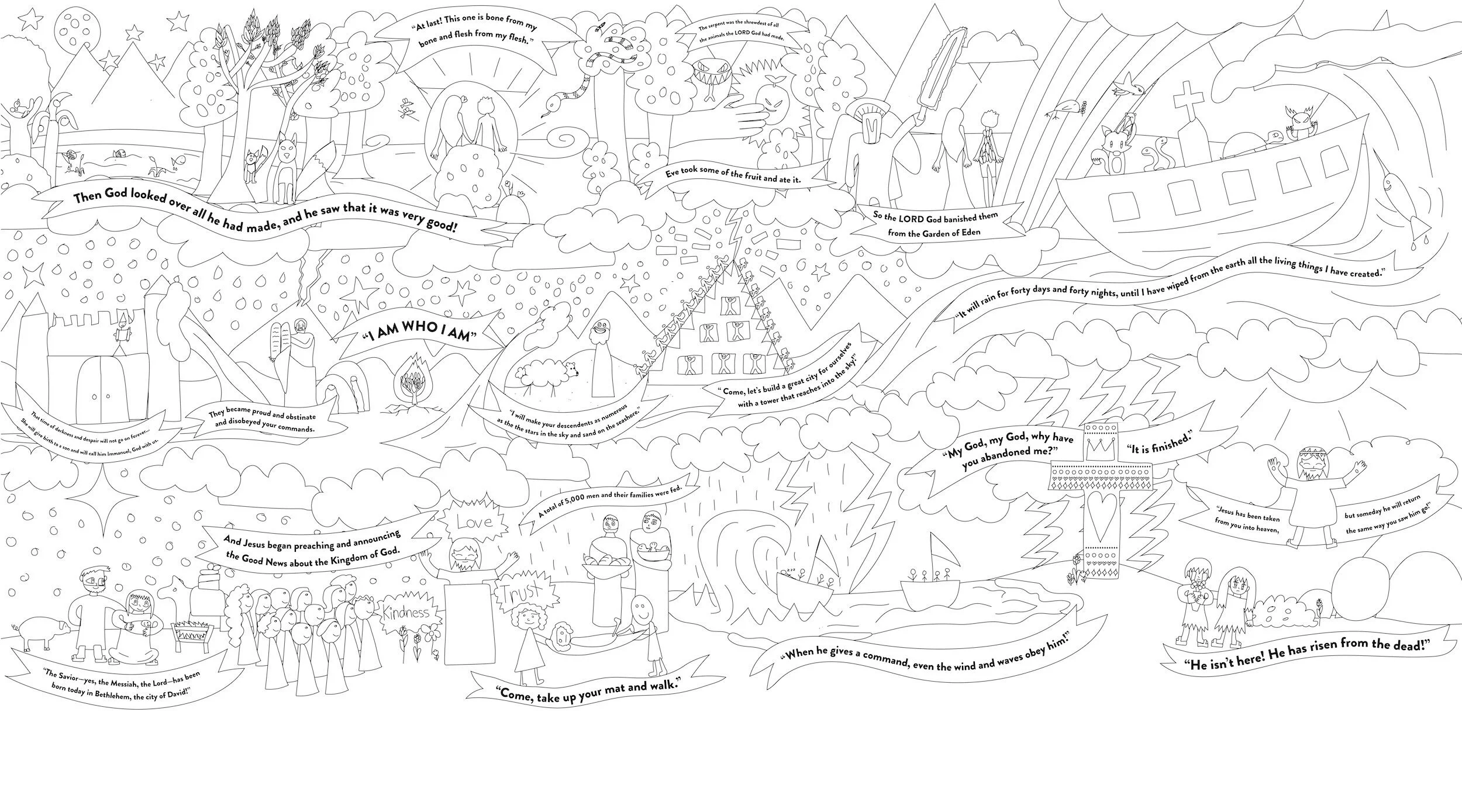 The mural team created videos to send out to Missio Kids every week, teaching them about different stories of the Bible. In response, Missio Kids created drawings, such as the drawings shown here (see Figures 1-4). The mural team then traced these drawings and adapted them as needed, creating a cohesive Story of the Bible mural design line drawing (see Figure 5). This line drawing was printed out on a giant canvas, ready to paint!