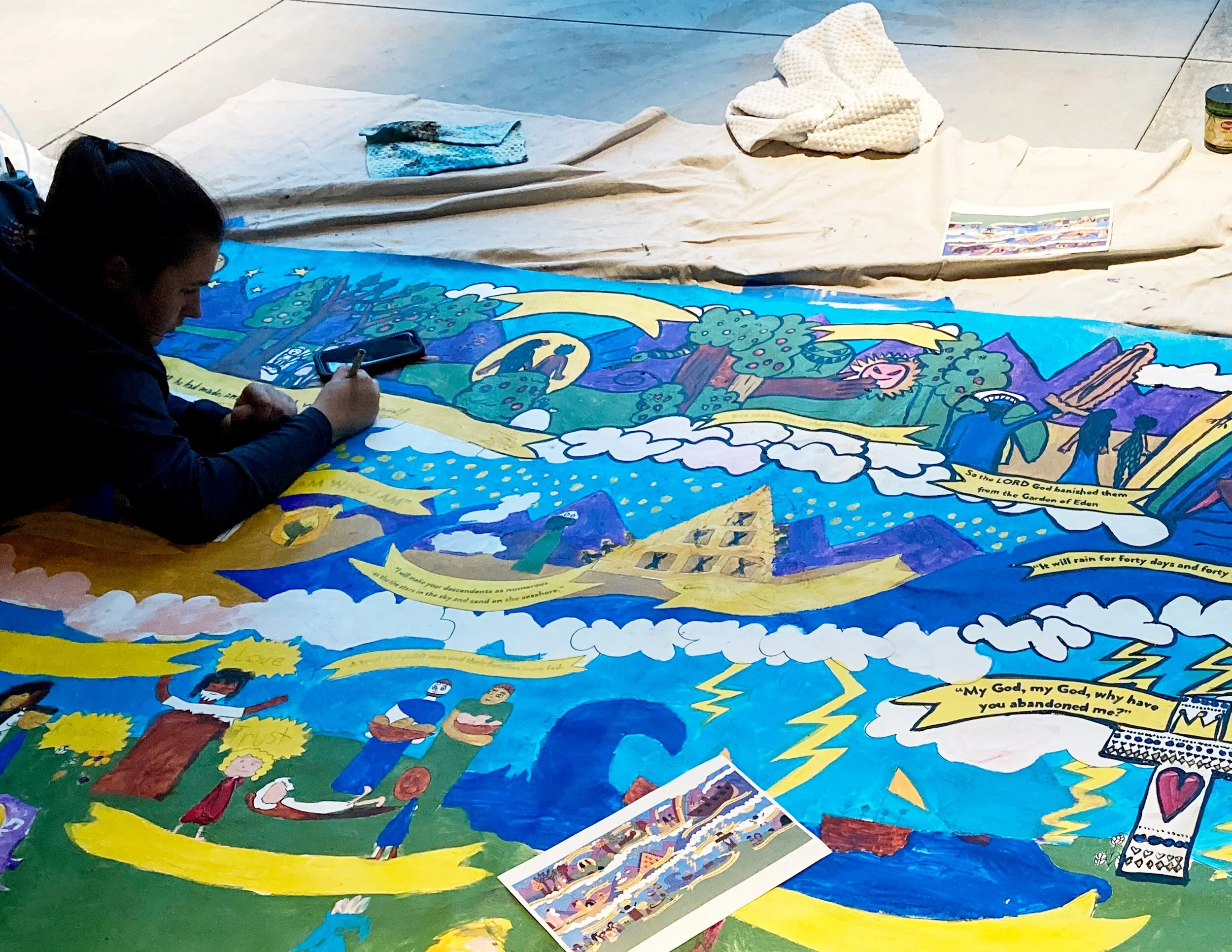 Creating art is an incredible way to connect with the original Creator. For the Story of the Bible Mural project, the team wanted to provide an opportunity for all members of our Missio Dei community to be involved in the process of creating. Missio kids and adults alike were able to participate in the work, giving them a connection with the story of the Bible, the artwork about it, and the church home that houses this mural.